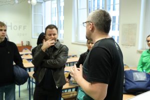 Trzecia trasa – od strony Wspólnej – zaczynała się na drugim piętrze. Tutaj dominowały prezentacje projektów społecznych, debat, wymian zagranicznych. Można było dowiedzieć się, jak wygląda współpraca z zagranicznymi szkołami, jak funkcjonuje profil mat-fiz-ang, czym różni się praca w klasach z geografią rozszerzoną od tej skoncentrowanej na biologii. W informatyce – sprzęt, programowanie, krótkie pokazy. A na końcu – zejście na pierwsze piętro i raz jeszcze: języki, biblioteka, stołówka.