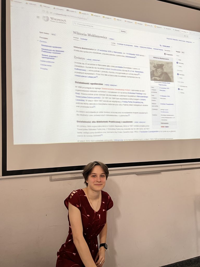 Z biegiem lat i dni… wydanej z okazji jubileuszu szkoły oraz publikacji dostępnych online. Rozmawialiśmy o wiarygodności różnych relacji oraz kanałów infomacyjnych i konieczności podawania źródeł informacji, a także o prawach autorskich. W ciągu kilku tygodni powstały trzy nowe biogramy (Władysława Hoszowska, Wiktoria Muklanowicz, Zofia Rudoszańska-Iwaszkiewiczowa). W biogramach wielu bohaterek (m.in. Marii Kownackiej, Barbary Drapińskiej, Heleny Skłodowskiej-Szalay, Izabeli Smolikowskiej, Marii Jadwigi Kotowskiej i Pauliny Hewelke) uzupełniono i rozbudowano informacje, dodano przypisy oraz ilustracje, np. zdjęcia, które można znaleźć w przestrzeni liceum. Młodzież w krótkim czasie pracowała z zaangażowaniem, a na pamiątkę oznaczyła salę, w której działała, wikipedystyczno-herstorycznymi naklejkami.