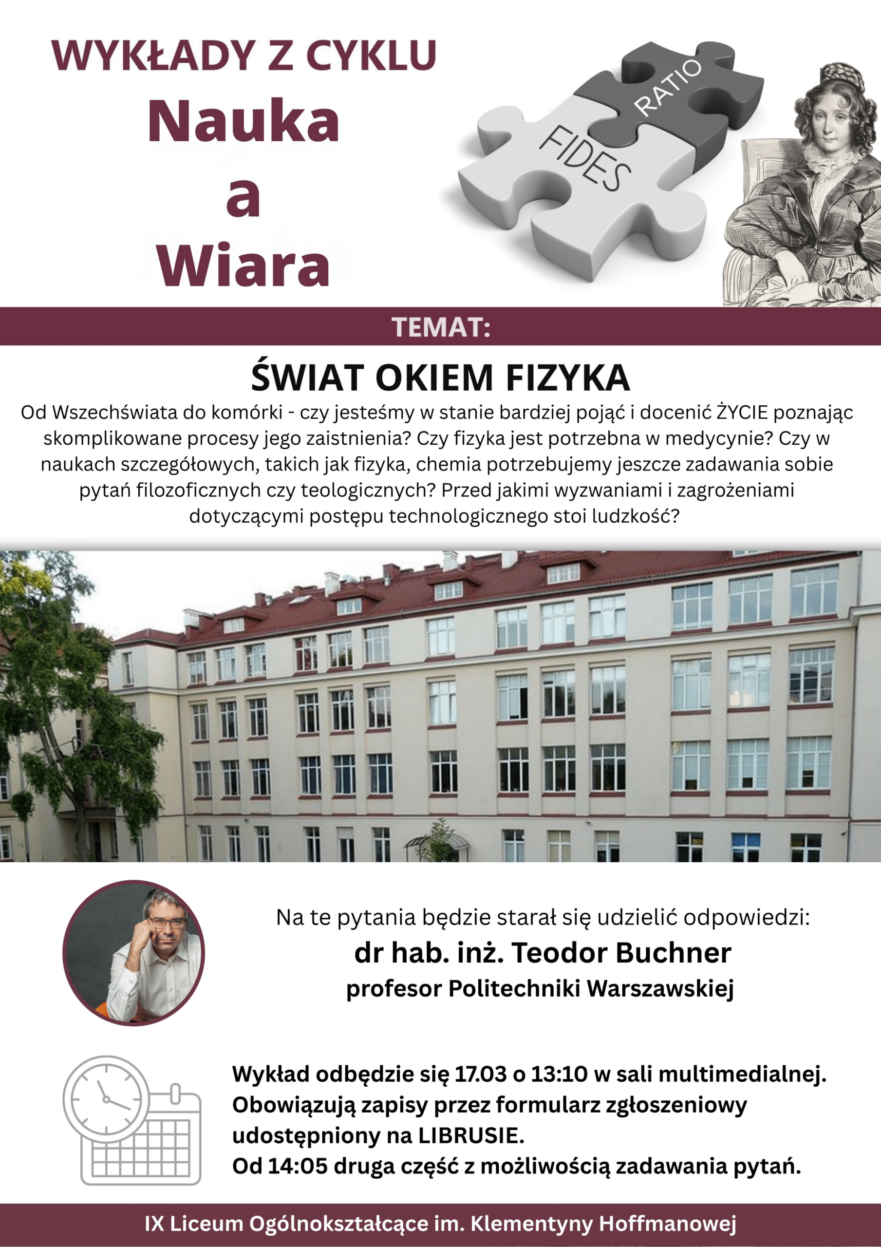17 marca w IX Liceum Ogólnokształcącym im. Klementyny Hoffmanowej odbył się kolejny wykład z cyklu „Nauka a Wiara”. Gościem spotkania był dr hab. inż. Teodor Buchner, profesor Politechniki Warszawskiej, który wygłosił prelekcję pt. „Świat okiem fizyka”.